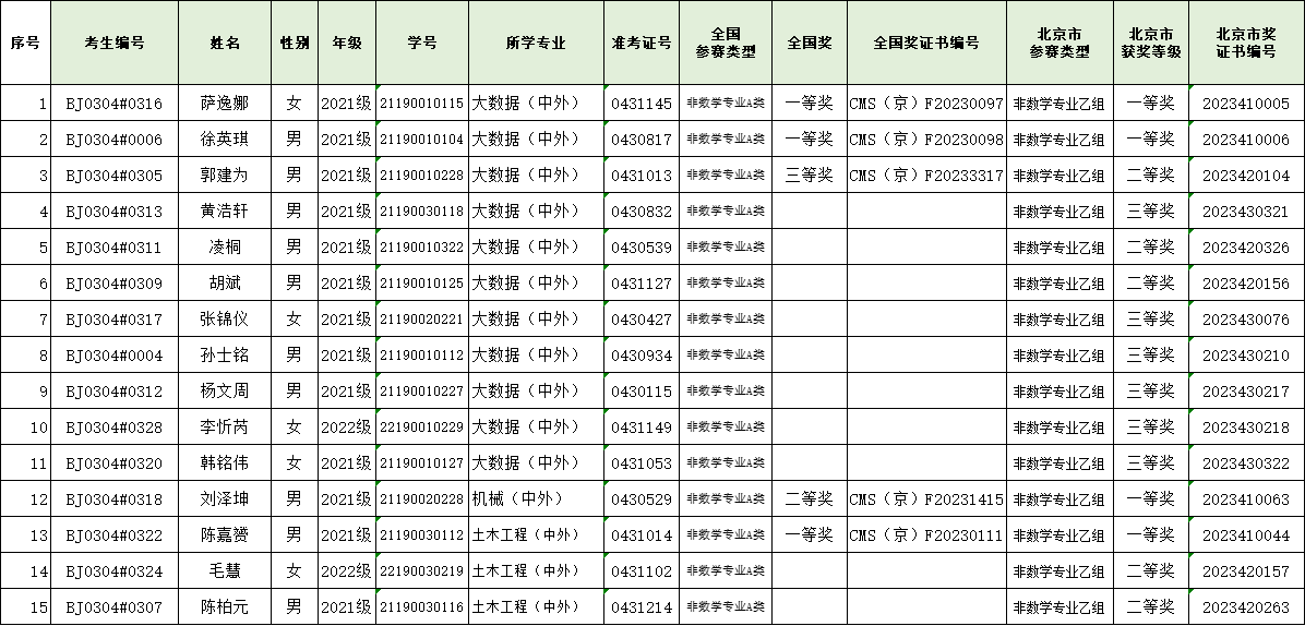 近日,北京市第三十四届大学生数学竞赛暨全国第十五届大学生数学竞赛预赛结果公布。我校112名考生在比赛中获得全国奖,其中一等奖20项,二等奖23项,三等奖69项。280名考生获得北京市级奖,其中一等奖72项,二等奖87项,三等奖121项(详见附件),获奖人数在同类院校中继续保持领先。此外,我校1名同学将作为北京赛区的参赛学生代表之一,参加将于2024年春季举行的全国第十五届大学生数学竞赛决赛。