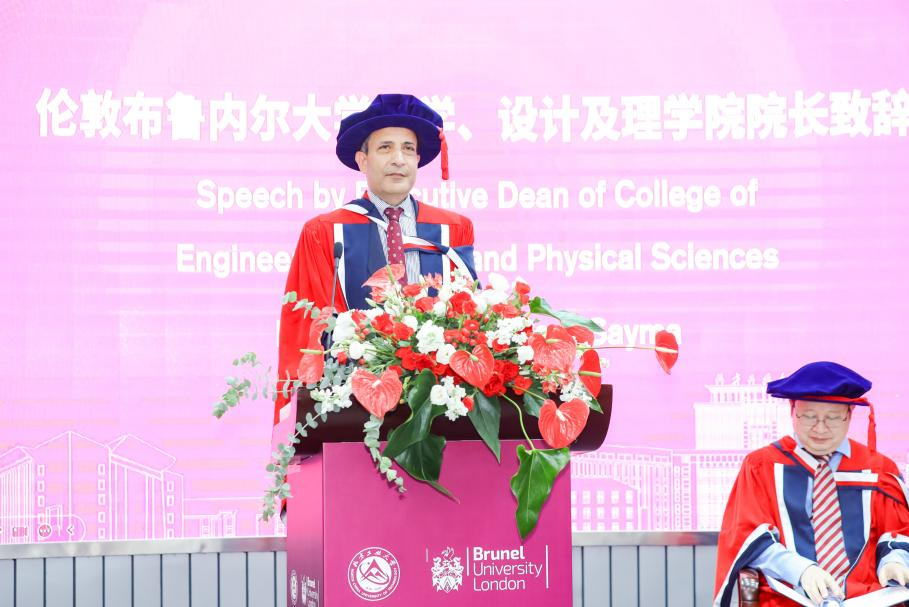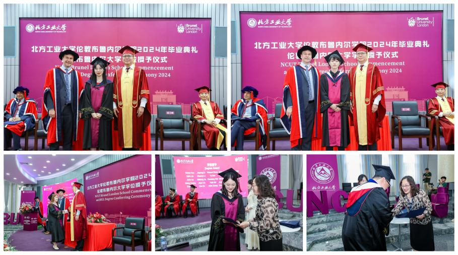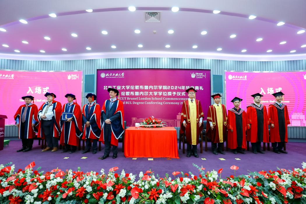 Maozhen Li主持学位授予仪式。102名毕业生依序上台,与两校长合影留念,现场领取伦敦布鲁内尔大学的学位证书。